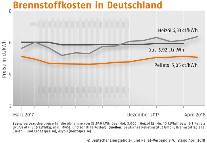 Im April 2018 kosteten Holzpellets in Süddeutschland 253,60 Euro/t (Vormonat: 254,39 Euro/t), in Deutschland Mitte 249,46 Euro/t (Vormonat: 253,92 Euro/t) und in der Region Nord-/Ostdeutschland 253,58 Euro/t (Vormonat: 257,61 Euro/t). Der DEPV-Index ist der Durchschnittspreis in Deutschland für eine Tonne Holzpellets der Qualitätsklasse ENplus A1 (Abnahme 6 t, Lieferung im Umkreis 50 km, inkl. aller Nebenkosten und MwSt.).