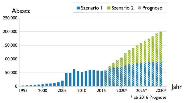 In Szenario 1 der Branchenstudie steigt der Wärmepumpen-Absatz auf 90.000 Geräte im Jahr 2030, der Marktanteil liegt bei 17,8 %. Der Absatz verlagert sich tendenziell in den Sanierungsmarkt. Insgesamt sind rund 1,61 Mio. Wärmepumpen in Betrieb (8,1 % des Wärmeerzeugerbestandes). In Szenario 2 wächst der Absatz auf 203.000 Geräte (Marktanteil 27 %).