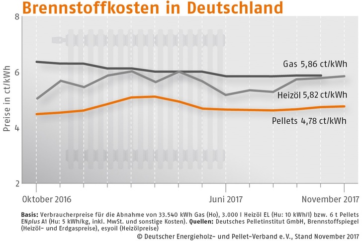 Im November 2017 kosteten Holzpellets in Süddeutschland 237,95 Euro/Tonne (Vormonat: 234,15 Euro/Tonne), in Deutschland Mitte 238,08 Euro/Tonne (Vormonat: 236,56 Euro/Tonne) und in der Region Nord-/Ostdeutschland 241,39 Euro/Tonne (Vormonat: 237,40 Euro/Tonne). Der DEPV-Index ist der Durchschnittspreis in Deutschland für eine Tonne Holzpellets der Qualitätsklasse ENplus A1 (Abnahme 6 Tonnen, Lieferung im Umkreis 50 km, inkl. aller Nebenkosten und MwSt.).