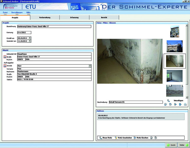 Erster wichtiger Schritt bei einer Schimmel-Bewertung ist die Aufnahme des Schadens. Die Software stellt hierfür entsprechende Erfassungsbögen zur Verfügung. Hauptaufgabe der Software ist die Unterstützung von Messungen. Die Analyse kann entweder durch eine Momentan- oder in der neusten Programmversion auch durch eine Langzeitmessung erfolgen. Dazu werden Temperatur- und Feuchtmessungen in dem von Schimmel betroffenen sowie in den angrenzenden Räumen vorgenommen.