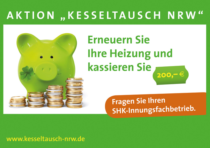 Die Aktion Kesseltausch NRW vom 1. März bis 30. Juni 2019 geht in die 5. Auflage. SHK-Innungsfachbetriebe in Nordrhein-Westfalen können während dieser 4 Monate ihren Kunden beim Einbau einer neuen Erdgas-Brennwertanlage einen Bonus von 200 Euro (inkl. MwSt.) verschaffen.