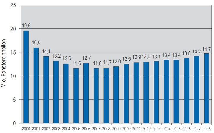 Die Zahl der im Neubau eingesetzten Fenster steigt mit plus 5,3 % merklich stärker an und erreicht damit einen Marktanteil von immerhin rund 43,5 %.