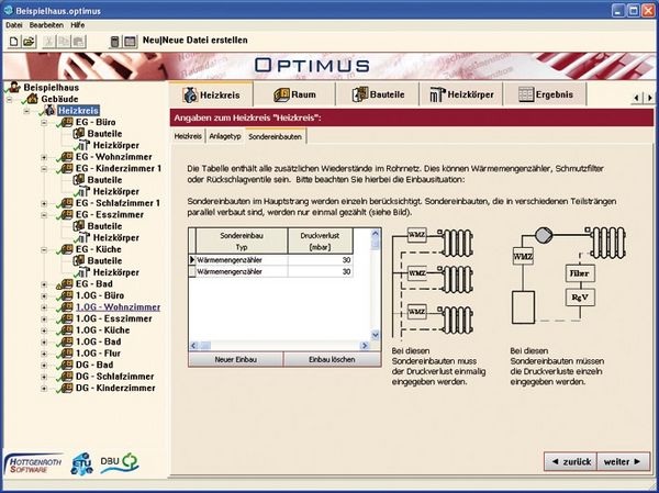 Hottgenroth / ETU hat mit der Software OPTIMUS ein technisch ausgereiftes und benutzerfreundliches Werkzeug für Anlagenplaner und Energieberater entwickelt. Es werden einfach und schnell alle relevanten Gebäude- und Anlagendaten über OPTIMUS erfasst und die Heizlast der einzelnen Räume überschlägig ermittelt. Aus dem Vergleich zwischen Heizleistung und Heizlast ergibt sich das neue Temperaturniveau für das Heizsystem. Das Ziel der Optimierung ist die ideale Kombination von Vor- und Rücklauftemperatur. Es folgt die Ermittlung der Druckverluste, unter Berücksichtigung aller Sondereinbauten, sowie der notwendigen Förderhöhe. Durch den Hydraulischen Abgleich werden schließlich die Widerstände berechnet, die vor jedem Heizkörper einzubauen bzw. einzustellen sind, um eine gleichmäßige Wärmeversorgung zu garantieren.