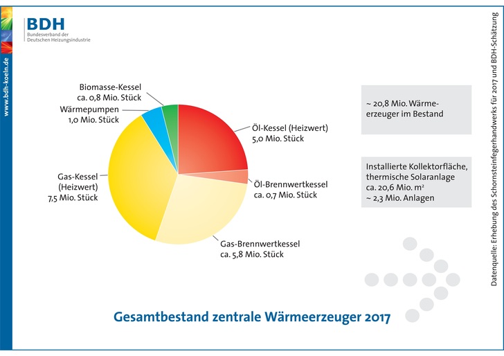 Auf Basis der Erhebungen des Schornsteinfegerhandwerks haben der Bundesverband des Schornsteinfegerhandwerks (ZIV) und Bundesverband der Deutschen Heizungsindustrie (BDH) die Bestandszahlen der zentralen Wärmeerzeuger im Jahr 2017 vorgelegt. Erstmals überstieg die Zahl der installierten Wärmepumpen in Deutschland 1 Mio. Stück. Damit tragen Wärmepumpen 5 % des Gesamtbestands von knapp 21 Mio. zentralen Wärmeerzeugern. 2017 wuchs der Absatz um 17 % auf 78.000 Heizungswärmepumpen. Manfred Greis, Präsident des BDH. „Drei Jahre in Folge wächst der Absatz von Wärmepumpen nunmehr überproportional. Mit 1 Mio. Stück im Bestand sehen wir den Marktdurchbruch dieser Effizienztechnologie gegeben.“