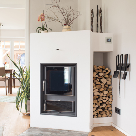 Die Energiebilanz nach einem Jahr (Anfang Juli 2018 bis Ende Juni 2019) kann sich sehen lassen. Die Solarwärme-Anlage deckt 70 % des Wärmebedarfs für die Raumheizung und das warme Wasser. Für die geringe Zusatzenergie, die notwendig ist, reicht der Kachelofen im Wohnzimmer aus. Er wurde nach den Vorstellungen der Bauleute gemauert. Das Holz stammt von einem Bauern in der Nähe.