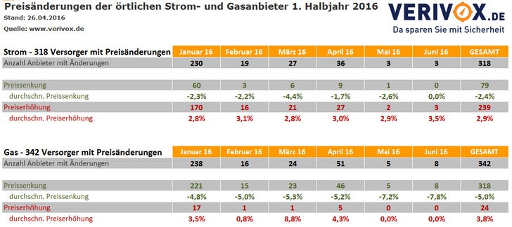 Die lokalen Energieversorger haben ihre Preisänderungen bis inklusive Juni 2016 vorgelegt. Eine Auswertung des Verbraucherportals Verivox hat ergeben, dass für viele Verbraucher seit Beginn des Jahres Strom teurer geworden ist. Die Gaspreise sind zum Ende der Heizperiode dagegen etwas gesunken.