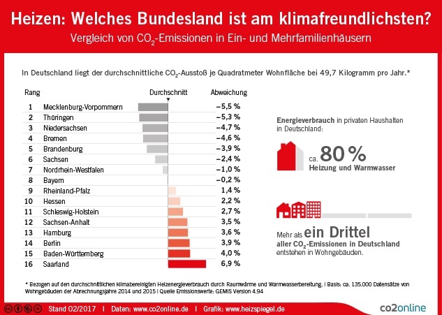 Beim Vergleich der Bundesländer sind aufgrund der unterschiedlichen spezifischen CO 2 -Emissionen der Energieträger die Länder im Vorteil, in denen Erdgas und Fernwärme häufig genutzt wird. Umgekehrt ist Bayern zwar das Bundesland mit dem geringsten Heizenergieverbrauch pro m 2 Wohnfläche – fällt aber beim CO 2 -Vergleich auf den 8. Platz zurück, weil dort häufiger Heizöl genutzt wird.