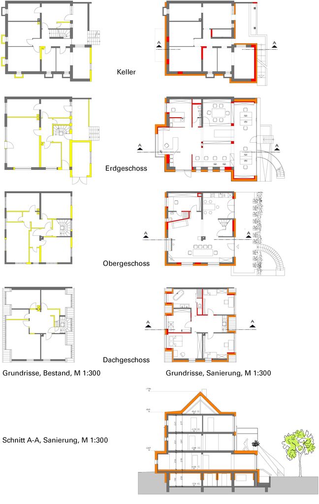 Die Ziele waren so schnell definiert wie hoch gesteckt: Nach dem Umbau sollte die energetische Qualität des Hauses mindestens 50 Prozent besser sein als das gesetzlich vorgeschriebene Niveau – viel mehr noch aber reizte es den Architekten, die verstaubte Altbau-Perle im Passivhausstandard neu glänzen zu sehen. Ein neuer Anbau im Erdgeschoss sollte genug Platz für das separat erschlossene Architekturbüro schaffen, während im um- und ausgebauten Ober- und Dachgeschoss die Familie Matzig mit Kind und Kegel Einzug halten würde (Abb. 1).