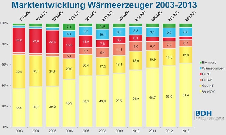 Stärker als der Markt ist 2013 die Verkaufszahl für Gas- und Öl-befeuerte Wärmeerzeuger um 7 % auf 599.000 Stück gewachsen. Die Entwicklung bei den beiden Haupt-Energieträgern im Wärmemarkt fiel erneut sehr unterschiedlich aus. Im Segment Gas-Brennwert gab es einen Zuwachs um 10 % auf 421.500 Stück (Marktanteil 61,4 %), bei Gas-Niedertemperatur stieg der Absatz um 2 % auf 110.000 Stück (Marktanteil: 16,0 %). Das Segment Öl-Brennwert verlor gegenüber dem Vorjahr 2 % auf 46.000 Heizkessel (Marktanteil: 6,7 %), bei Öl-Niedertemperatur betrug der Absatzrückgang 8 % (2012: 19 %) auf 21.500 Heizkessel (Marktanteil: 3,1 %).