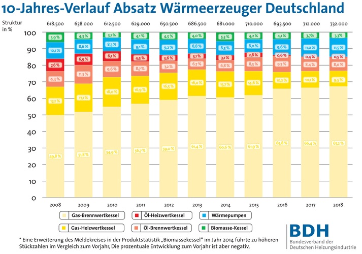 Erneut war Gas-Brennwerttechnik mit 492 500 abgesetzten Geräten und einem Plus von 4 % gegenüber dem Vorjahr die am meisten nachgefragte Technik. Wie bereits im Vorjahr landeten auf dem 2. Platz Wärmepumpen mit 84 000 verkauften Geräten und einem Plus von 8 %. Danach folgt Öl-Brennwerttechnik mit 58 500 Geräten (–3 %). Bei Systemen auf Basis von Biomasse gab es mit 24 000 verkauften Geräten ein Minus von 9 %.