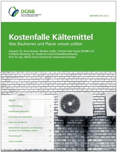 Die Nutzung passiver Systeme belohnt die DGNB im Rahmen der Gebäudezertifizierung im Kriterium „Einsatz und Integration von Gebäudetechnik“. Darüber hinaus werden Kältemittel noch in drei weiteren Kriterien adressiert: Die „Ökobilanz des Gebäudes“, „Risiken für die lokale Umwelt“ und „Gebäudebezogene Kosten über den Lebenszyklus“. Bei letzterem wird beispielsweise eine Analyse des Einsatzes von Kältemitteln sowie der möglichen Um- und Nachrüstungskosten empfohlen.