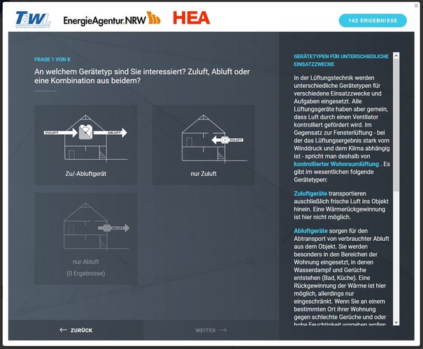 Die komplett neu gestaltete Gerätesuche bietet Planern einen vereinfachten Zugriff auf diese Daten. Acht aufeinanderfolgende Fragen führen den Nutzer gezielt zu der Gerätevariante, die für sein Projekt passend sein könnte. Neue Grafiken und Hilfetexte helfen bei der Beantwortung der Fragen. Die Suche wurde außerdem „mobile first“ gestaltet, ist also auf Smartphones und Tablet-PCs voll einsatzfähig. Mit optionalen Fragen, z.B. nach einem Passivhauszertifikat, kann die Suche verfeinert werden.