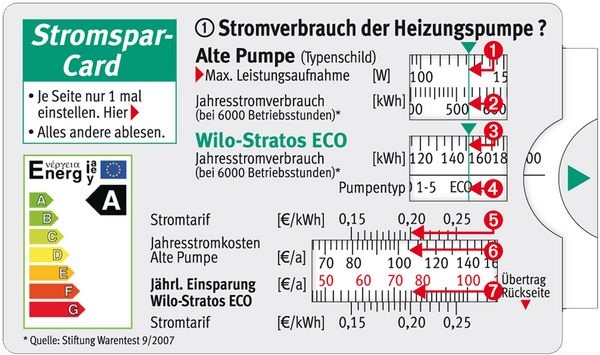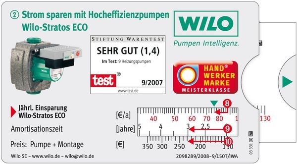 Zur Verkaufsunterstützung von Hocheffizienzpumpen hat Wilo jetzt einen Rechenschieber im Scheckkarten-Format entwickelt. Mit der „Stromspar-Card“ lässt sich auf Basis des Stromverbrauchs der Altpumpe in wenigen Sekunden ermitteln, welche Einsparung an elektrischer Arbeit der Pumpenaustausch bringt. Unter Berücksichtigung des individuellen Stromtarifs werden dann die jährlichen Stromkosten der alten Pumpe und die Einsparungen durch die Hocheffizienzpumpe und die Amortisationszeit aufgezeigt.