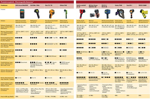 Die Kamera-Modellvielfalt ist insbesondere im unteren und mittleren Preissegment (ab 2000 bzw. ab 5000 Euro) mittlerweile sehr groß. Auf folgende wichtige Merkmale (Kursivdruck) sollte man besonders achten: Zu den wichtigsten Geräteparametern zählen die Bilddaten: die Detektorauflösung gibt an, in wie viele Pixel in X- und Y-Richtung der Detektor die von der Optik erfassten Daten auflösen kann. Kameras für Einsteiger verfügen über eine Detektorauflösung von 160 x 120, für Fortgeschrittene ab 320 x 240 und für Profis ab 640 x 480 Pixel. Das Sehfeld gibt in vertikaler und horizontaler Richtung den Erfassungsbereich der mitgelieferten Optik an. Auch die geometrische Auflösung (IFOV) entscheidet über die Bildqualität. Der IFOV-Wert ist abhängig vom aktuell eingesetzten Objektiv, das optional durch ein Weitwinkel- oder Teleobjektiv austauschbar sein sollte. Wichtige Parameter bei der Messung sind der erfasste Temperaturbereich, der bei Bauthermografie-Kameras zwischen –20 °C und +100 °C liegen sollte und der so genannte NETD-Wert. Er gibt die kleinste Temperaturdifferenz an, die vom Detektor noch erfasst werden kann. Je kleiner dieser Wert für die Temperaturempfindlichkeit ist, desto geringer ist die Gefahr des sogenannten „Bildrauschens“. Die Genauigkeit gibt die Messabweichung in Prozent bei 30 °C an; sie nimmt mit hohen oder niedrigen Temperaturen ab. Zu den Kameraeinstellmöglichkeiten sollten mindestens eine präzise Eingabe des Emissionsgrades und der reflektierten Temperatur sowie optional des Messabstands und der Luftfeuchte gehören. Zu den Messfunktionen, d.h. das, was direkt am Kamera-Display radiometrisch ausgewertet werden kann, sollte mindestens die Anzeige von Isothermen sowie des Minimal- und Maximalwerts gehören. Eine Taupunktberechnung bieten nur einige Kameras. Die in der Regel aus Germanium-Linsen bestehende Optik sollte möglichst wahlweise eine manuelle oder automatische Fokussierung ermöglichen. Optionale Objektive erweitern die Einsatzmöglichkeiten der Kamera. Vor allem Weitwinkelobjektive sind für die Aufnahme in beengten räumlichen Situationen wichtig. Im internen Speicher sollten möglichst viele Bilddaten abgelegt werden können. Ein zusätzlicher Wechselspeicher (möglichst im verbreiteten SD-Kartenformat) schafft unterwegs Speicherreserven. Zusatzfunktionen wie ein Laserpointer oder eine Digitalkamera vereinfachen die Lokalisierung von gemessenen Minimal-/Maximalwerten bzw. erleichtern die Bildorientierung. Eine Bild-im-Bild-Funktion ermöglicht die Überlagerung von Tageslicht- und Infrarotfotos. Beim Gehäuse sollte auf kompakte Abmessungen, ein geringes Gewicht und „Baustellentauglichkeit“ (Schutzklasse ab IP 54 = staub- und spritzwassergeschützt) geachtet werden. Über die verbleibende Betriebszeit sollte eine Akku-Ladestandanzeige Auskunft geben. Die in der Regel wechselbaren Lithium-Ionen-Akkus sollten sich schnell aufladen lassen und möglichst lange durchhalten. Zum Standard-Zubehör sollte ein Netzteil, eine Ladestation, ein Netz- und USB-Kabel, ein stabiler Transportkoffer sowie Auswertungs-Software gehören. Auch den Anbieter sollte man bei der Produktwahl nicht unberücksichtigt lassen: Seit wann ist er auf dem Markt? Wer zählt zu seinen Kunden? Bietet er auch Schulungen an? Wie gut ist sein Service etc.?