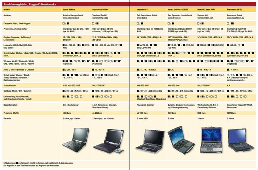 Nur etwa ein halbes Dutzend Anbieter offerieren fully-ruggedized-Notebooks, etwas mehr sind es in der Semi-Klasse. Die tabellarische Marktübersicht erhebt keinen Anspruch auf Vollständigkeit und soll lediglich einen vergleichenden Überblick über wichtige Leistungsdaten aktueller Modelle geben. Die Anbieter haben teilweise mehrere fully- und semi-ruggedized Notebooks im Produktportfolio. Ausgewählt wurden jeweils maximal zwei pro Hersteller, meist jene Modelle mit dem größten Monitor.