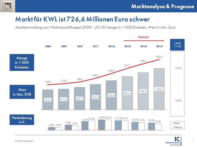 Interconnection rechnet jedoch damit, dass sich diese Geräte in Zukunft in allen Märkten etablieren werden. Der Grund hierfür liegt in der Renovierung. In den letzten Jahren wurden viele Fenster ausgewechselt, sodass ein großer Bedarf an kontrollierter Frischluftzufuhr besteht. „Einzelraumlüfter lassen sich schnell und einfach installieren; der Wärmerückgewinnungseffekt ist das ausschlaggebende Argument gegenüber reinen Abluftanlagen“, so Dennis Rauen, Autor der Studie. Interconnection rechnet im Zeitraum 2012 bis 2015 mit einem jährlichen Durchschnittswachstum von 16,3 % in Menge. Zum Vergleich: zentrale Anlagen werden im gleichen Zeitraum um 11,2 % wachsen, Abluftanlagen hingegen um 8,5 %.