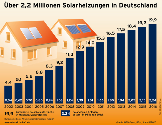 Niedrige Öl- und Gaspreise hätten im letzten Jahr den Modernisierungsdruck niedrig gehalten, so die Verbände. Dabei sind die staatlichen Zuschüsse für den Umstieg auf Solarwärme so hoch wie nie: Für die solare Heizungsmodernisierung eines Eigenheims beträgt er in der Regel 3600 Euro. Die Eigenheimbesitzer lockt das jedoch kaum. Die Antragszahlen für Solarthermieanlagen im Marktanreizprogramm des BAFA lagen 2016 mit 23.027 noch unter dem Wert in 2015 (26.308 Anträge). Die Verbesserung der Förderkonditionen ab April 205 hat den Markt nicht beflügelt, 2014 wurden 24.383 Anträge gestellt, 2013 waren es 33.301. GLR