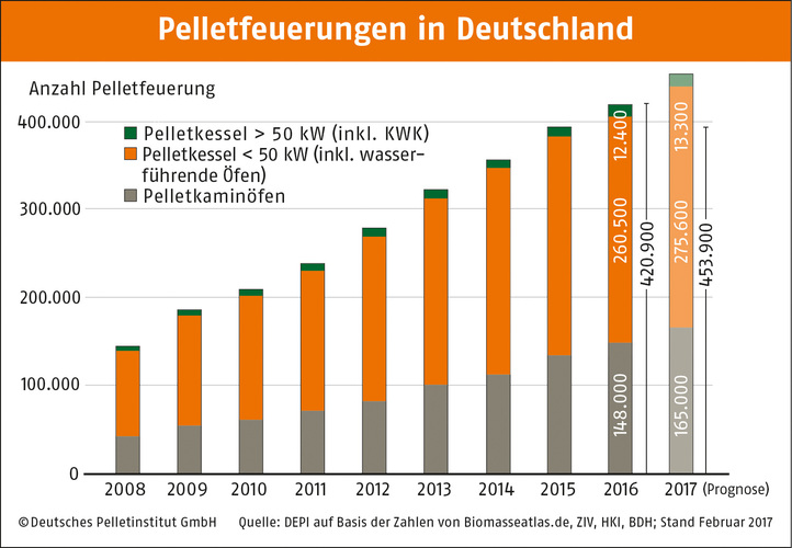 Auch die hohen Fördersätze im Marktanreizprogramm für erneuerbare Energien (MAP), die mit dem Aktionsprogramm Energieeffizienz (APEE) im Januar 2016 sogar noch um 20 % erhöht wurden, haben nicht zu einem Aufschwung geführt. Eine gute Nachfrage in einigen Bundesländern bereits zu Beginn des Jahres 2017 lässt die Pelletbranche jedoch mit verhaltenem Optimismus in die Zukunft blicken: Für das Jahr 2017 geht der DEPV von einem Absatz von 33.000 Feuerungen (16.000 Pellet-Heizkessel und 17.000 Pellet-Kaminöfen) aus. Damit würde der Gesamtbestand an Pelletfeuerungen auf knapp 454.000 Anlagen anwachsen.