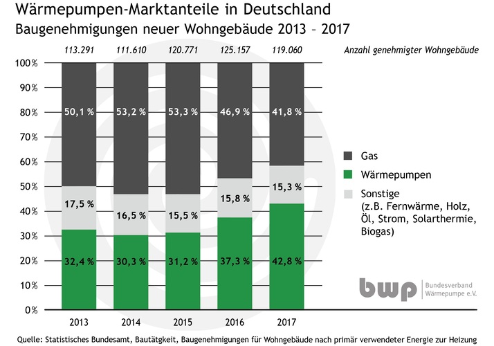 Erdwärme kam bei den genehmigten Wohngebäuden auf einen Anteil von 8 %, rund 35 % werden mit Umweltwärme aus Luft oder Grundwasser geheizt. Wärmepumpen liegen damit erstmals knapp vor den Gas-Heizungen, die 42 % der Bauherren in ihrem neuen Wohngebäude einsetzen. „Der positive Effekt der Energieeinsparverordnung 2016 trägt sicher zu dieser Entwicklung bei, auch die Förderung von KfW und BAFA hilft natürlich“, erläutert BWP-Geschäftsführer Dr. Martin Sabel: „Die Wärmepumpe wird von Bauherren, Planern und Fachhandwerkern mehr und mehr als das Standardheizsystem für den Neubau anerkannt. Wir erwarten, dass der Anteil weiter deutlich steigen wird.“