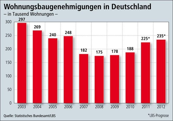 ) für 2011 von einem Sprung um 20 % gegenüber dem Vorjahr auf 225.000 genehmigte Wohneinheiten aus. Für 2012 prognostiziert LBS-Verbandsdirektor Hartwig Hamm ein weiteres Wachstum um knapp 5 % auf 235.000 Genehmigungen. Vor allem die niedrigen Zinsen gäben jetzt auch dem Neubau Impulse. Die Fertigstellungszahlen folgen der Entwicklung bei den Genehmigungen erst mit einer gewissen zeitlichen Verzögerung. Deshalb ist nach Einschätzung der LBS nach dem absoluten Tiefpunkt im Jahr 2009 mit 159.000 fertiggestellten Wohneinheiten auch 2011 noch nicht mit einem Ergebnis oberhalb der Marke von 200.000 Fertigstellungen zu rechnen, sondern erst ab 2012. Der Trend sei jedoch insgesamt deutlich aufwärts gerichtet.