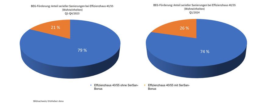 Jede 6. Sanierung zum Effizienzhaus 40 oder 55, die 2023/24 im Rahmen der Bundesförderung effiziente Gebäude (BEG) beantragt wurde, ist eine serielle Sanierung. Bezogen auf die Wohneinheiten war es im 1. Quartal 2024 sogar jede 4. Wohnung, die seriell saniert werden soll. Das zeigt eine aktuelle Auswertung der BEG-Förderung, die seit Anfang 2023 auch einen Bonus für die serielle Sanierung von Wohngebäuden beinhaltet. Vor Einführung des Bonus machten serielle Sanierungen nicht einmal 2 % aus, der Schwerpunkt lag auf Pilotprojekten.