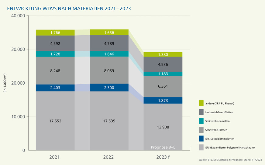 Keine großen Veränderungen hat es bei den Marktanteilen der in WDVS eingesetzten Dämmstoffe gegeben. Die EPS-Menge einschließlich Sockelplatten sinkt laut einer Prognose des Marktforschungsinstituts B+L von 19,8 auf 15,8 Millionen Quadratmeter. Das entspricht einem Marktanteil von 54 Prozent (2022: 55,1 Prozent). Steinwolle – Platten und Lamellen – kommt in diesem Jahr auf 7,5 Millionen Quadratmeter, nach 9,7 Millionen Quadratmeter im Vorjahr. Der Anteil sinkt auf 25,8 Prozent (2022: 27 Prozent). Der Absatz von Holzweichfaserplatten sinkt von 4,8 auf 4,5 Millionen Quadratmeter. Das Material hat seinen Marktanteil allerdings von 13,3 auf 15,5 Prozent vergrößert. Bei den weiteren in WDVS eingesetzten Dämmstoffen wie PU, Phenol und XPS verzeichnet die Branche Rückgänge, aber nahezu keine Abweichungen bei den Markanteilen. Quelle: VDPM / jb