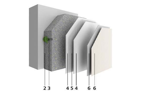 (1 — Verklebung: Entfällt bei der Montage mit StoFix Circonic), 2 — Dämmung: Sto-Steinwolleplatte oder Sto-Dämmplatte Top32 Biomass, 3 — Befestigung: StoFix Circonic, 4 — Unterputz: StoArmat Classic AimS®, 5 — Bewehrung / Armierung: Sto-Glasfasergewebe, 6 — Schlussbeschichtung: Stolit AimS®, 6 — Anstrich (optional): StoColor Lotusan AimS®)