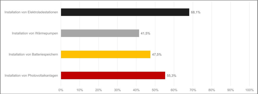 Insbesondere kleine Elektrobetriebe erkennen in der Energiewende eine Chance. Sie bieten ihren Kundinnen und Kunden eine oder sogar mehrere Dienstleistungen aus dem Bereich der Zukunftstechnologien an. Das verdeutlichen Ergebnisse der Frühjahrskonjunkturumfrage unter 1.762 Betrieben, die der Zentralverband der Deutschen Elektro- und Informationstechnischen Handwerke (ZVEH) durchgeführt hat. Demnach setzt ein Viertel der befragten e-handwerklichen Betriebe konsequent auf Sektorenkopplung und ist in allen Energiewende-Geschäftsbereichen tätig: Ladeinfrastruktur für E-Mobilität, Photovoltaik und Wärmepumpen. Das Engagement macht sich besonders bei der Installation von Photovoltaik und Stromspeichern in wachsenden Umsatzanteilen bemerkbar: Er stieg zwischen Frühjahr 2022 und Frühjahr 2024 von 3,3 auf 7,7 Prozent.