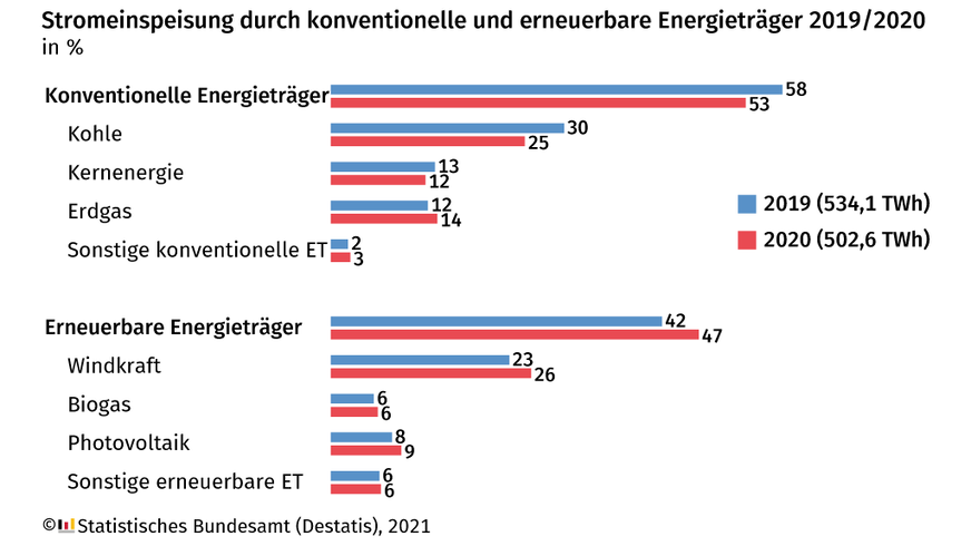 502,6 Milliarden Kilowattstunden Strom wurden im vergangenen Jahr in Deutschland erzeugt und in das Stromnetz eingespeist. Das meldet das Statistische Bundesamt (Destatis). Der Anteil der erneuerbaren Energien an der im Inland erzeugten und eingespeisten Strommenge hat mit 47 Prozent einen neuen Höchststand erreicht. 2019 hatten unter anderem Windkraft, Photovoltaik und Biogas 42,3 Prozent des Stroms erzeugt. Mit der Windkraft erzielte erstmals ein erneuerbarer Energieträger den höchsten Anteil an der in einem Jahr eingespeisten Strommenge. Sie löste damit Kohle als wichtigsten Energieträger ab.