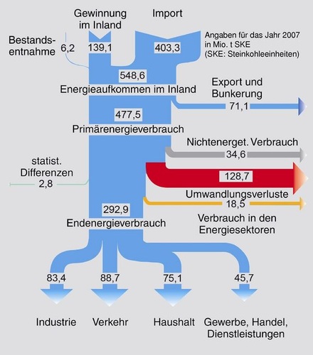 Aus dem von der AGEB jetzt aktualisierten Energieflussbild für das Jahr 2007 geht hervor, dass nach Abzug von 71 Mio. t SKE für Exporte 477,5 Mio. t SKE an Primärenergieträgern zur Verfügung standen. Davon beanspruchten der nichtenergetische Verbrauch in den Grundstoffindustrien, Unwandlungsverluste und der Eigenverbrauch der Energiewirtschaft rund 185 Mio. t SKE. Zur Deckung des Endenergiebedarfs von Industrie, Verkehr und Haushalten sowie Gewerbe, Handel und Dienstleistungsbranche verblieben knapp 293 Mio. t SKE. Den größten Anteil am Endenergieverbrauch hatte der Verkehr mit 30,3%. Auf die Industrie entfielen 28,5% und auf die privaten Haushalte 25,6%. Der Anteil von Gewerbe, Handel und Dienstleistungen betrug 15,6%.