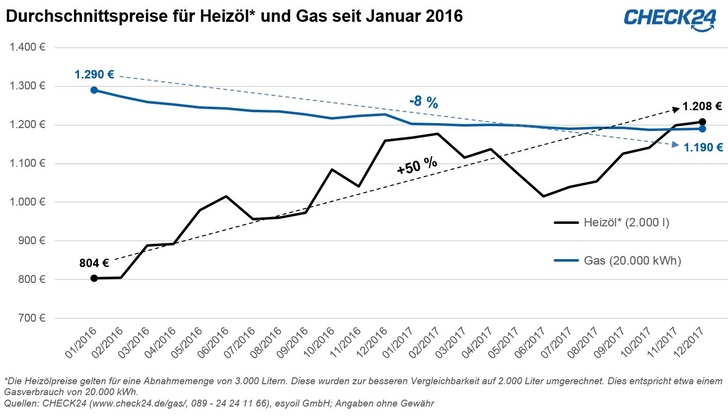 Während die Heizölpreise steigen, wird Gas immer günstiger. Seit Januar 2016 ist der Check24 -Gaspreisindex um 8 % gesunken. Dadurch zahlen Verbraucher seit Jahresende 2017 für Gas wieder weniger als für Heizöl. 20.000 kWh Gas kosteten im Schnitt 1190 Euro. Für die vergleichbare Menge an Heizöl waren 1208 Euro fällig.