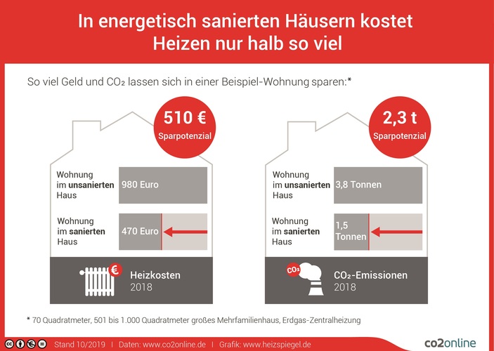 Während Bewohner in energetisch guten Häusern im Schnitt 470 Euro zahlten, war es in energetisch schlechteren Häusern mehr als doppelt so viel: 980 Euro. Das zeigt der Heizspiegel für Deutschland 2019 , den die gemeinnützige Beratungsgesellschaft co2online im Auftrag des Bundesumweltministeriums und in Zusammenarbeit mit dem Deutschen Mieterbund sowie dem Verband kommunaler Unternehmen im Rahmen der Kampagne „Mein Klimaschutz“ veröffentlicht hat.