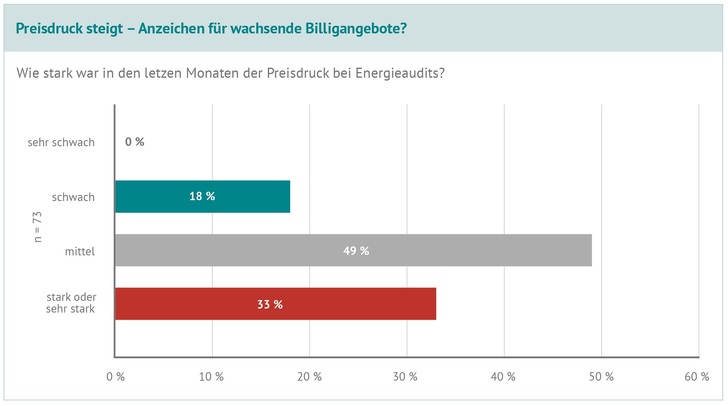 So zeigt eine aktuelle Befragung der Deneff zwar, dass die Mehrzahl der Befragten die 2014 in Kraft getretene Verpflichtung für wirkungsvoll hält, jedoch spüren diejenigen der Unternehmen, die selbst Energieaudits anbieten, einen Anstieg des Preisdrucks. Ein möglicher Hinweis auf Billigangebote von niedriger Qualität. Siehe auch im GEB-Forum: Energieaudits - neues Geschäftsfeld oder kurzer Hype?