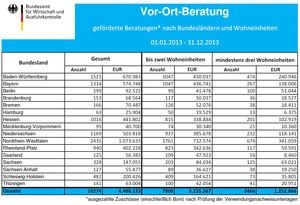 Zudem ist beabsichtigt, als Gesamtüberblick eine entsprechende Tabelle für das jeweils abgelaufene Kalenderjahr zu veröffentlichen. Die Auswertung für das Kalenderjahr 2013 wurde bereits zur Verfügung gestellt ( Link zu den Daten ). Danach wurden im Jahr 2013 insgesamt 10.274 Zuschüsse für geförderte Beratungen ausgezahlt (7808 für Ein- und Zweifamilienhäuser, 2466 für Mehrfamilienhäuser).