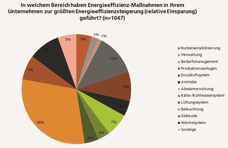 Knapp ein Drittel der befragten Unternehmen – je größer die Unternehmen, desto höher der Anteil – erfasst seine Energieverbräuche systematisch, bei den Großunternehmen ist es fast die Hälfte. 45 % der Unternehmen, die Energiedaten speichern, tun dies zur Identifizierung von Energieeffizienz-Potenzialen und entsprechenden Maßnahmen. Die bei der Beleuchtung ergriffenen Maßnahmen haben dabei am häufigsten zu den größten relativen Einsparungen geführt.