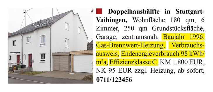Die erforderlichen Pflichtangaben in Immobilienanzeigen hängen davon ab, wann der Ausweis ausgestellt wurde und um welchen Immobilientyp es sich handelt. Bei neuen, ab Mai 2014 ausgestellten Ausweisen müssen Inserenten die Art des Energieausweises (Bedarfs- oder Verbrauchsausweis), den Wert des Endenergiebedarfs (bei Bedarfsausweisen) oder Endenergieverbrauchs (bei Verbrauchsausweisen) und die im Ausweis genannten wesentlichen Energieträger der Heizung (zum Beispiel Erdgas) angeben.Bei Wohngebäuden müssen zudem Baujahr und Energieeffizienzklasse angegeben werden. Liegt für die Immobilie ein Energieausweis aus dem Zeitraum 1. Oktober 2007 bis 1. Mai 2014 vor, kann auf die Angabe der neuen Energieeffizienzklasse verzichtet werden. Zusätzlich gilt bei verbrauchsbasierten Energieausweisen für Wohngebäude, die vor dem 1. Mai 2014 ausgestellt wurden: Sofern der Warmwasseranteil nicht im Energieverbrauchskennwert enthalten ist, müssen Inserenten den Wert um 20 kWh/(m 2 a) erhöhen.