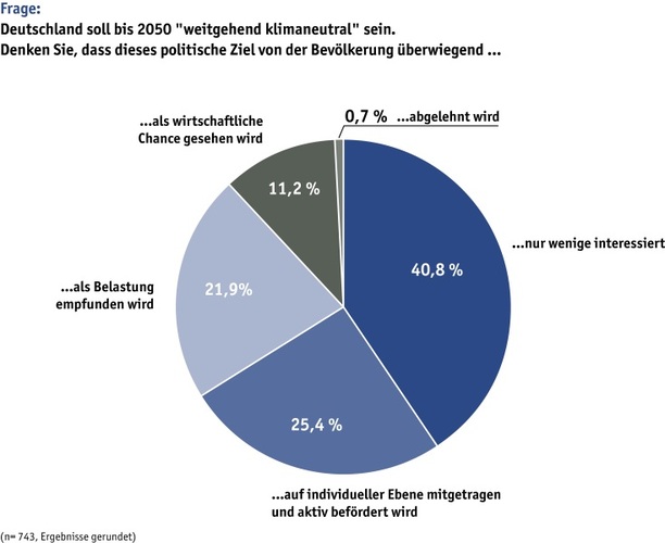 Wenn auch quer durch die Republik Anstrengungen laufen, Themen wie energetische Gebäudesanierung oder Energie-Einsparung für die Breite der Bevölkerung interessant – ja sogar „sexy“ – zu machen: Über 40 % der Befragten glauben, dass die Klimaziele der Bundesregierung „nur wenige interessieren“. Über 20 % schätzen die Stimmung in der Republik sogar als negativ ein („Klimaziele werden als Belastung empfunden“). Nur ein Viertel glaubt, dass die politischen Ziele („Klimaneutralität 2050“) auf individueller Ebene mitgetragen und/oder befördert werden.