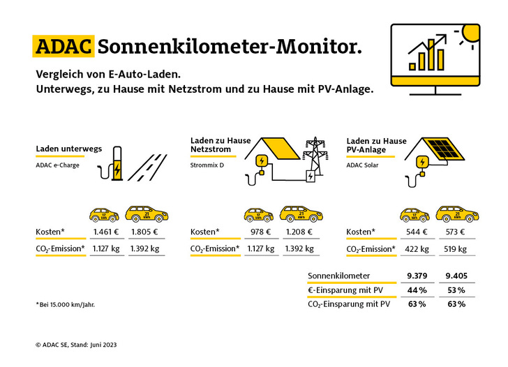 Er nutzt den ADAC-Solarrechner, der basierend auf der Lage und den individuellen Voraussetzungen der Immobilie die zu erwartenden Sonnenstrom-Erträge über den Jahresverlauf zeigt. Dazu weist er die möglichen Sonnenkilometer, die mit dem Solarenergie-Anteil im Elektroauto zurückgelegt werden können, sowie den Reststrombedarf vom herkömmlichen Energieversorger aus. Abhängig von Fahrzeugklasse, Fahrleistung und Verbrauch lassen sich zum Beispiel jährlich in einem durchschnittlichen Vier-Personen-Eigenheim bei einem 80-prozentigen Eigenstromanteil mehrere Tausend „Frei-Kilometer“ erwirtschaften und insgesamt mehr als vier Tonnen CO2 einsparen.