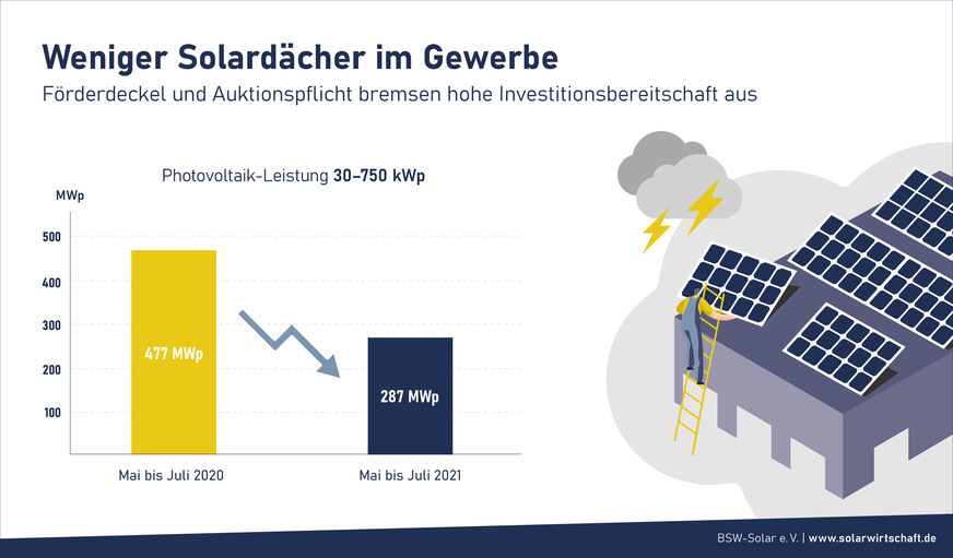 Die am 31. August 2021 veröffentlichten Meldedaten der Bundesnetzagentur belegen laut BSW einen deutlichen Einbruch insbesondere bei der neu installierten Photovoltaik-Leistung auf Gewerbedächern der Leistungsklasse 30 bis 750 Kilowatt. So sei die neu gemeldete PV-Leistung in den Monaten Mai bis Juli 2021 um 40 Prozent gegenüber dem Vorjahreszeitraum gesunken.