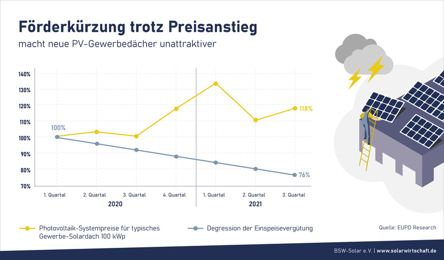 Zwei Ursachen hat der BSW für diesen Nachfragerückgang vorrangig ausgemacht: So sank seit Anfang vergangenen Jahres die Solarstrom-Förderung für die Betreiber neuer gewerblicher Solardächer um rund 25 Prozent, während die Preise schlüsselfertiger Solarsysteme im gleichen Zeitraum nach Erhebungen von EUPD Research um rund 20 Prozent zunahmen. Für Unternehmer werde es dadurch wirtschaftlich zunehmend unattraktiver, in Solarzellen zu investieren. Die viel zu schnelle Degression der Solarstromförderung resultiert aus dem in § 49 EEG fixierten niedrigen PV-Ausbaukorridor.
