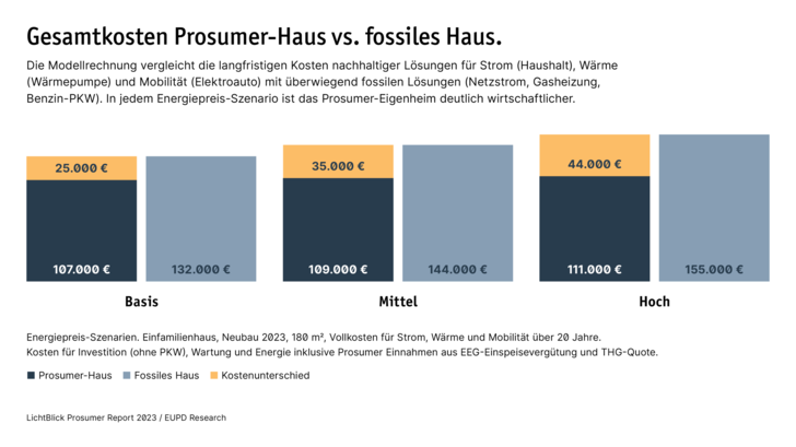 Mit Investitionen in Photovoltaik, Heimspeicher, Wärmepumpen und Elektroautos machen sich Hausbesitzer:innen weitgehend unabhängig von steigenden Energiepreisen. Das belegen zwei repräsentative Modellrechnungen für Einfamilienhäuser. Dabei werden über 20 Jahre Investitions- und Energiekosten von erneuerbaren Lösungen mit fossilen Alternativen für Hausstrom, Wärme und PKW-Mobilität verglichen. Mit erneuerbaren Technologien sparen Hausbesitzer:innen im Sanierungs-Beispiel bis zu 49 Prozent beziehungsweise 51.000 Euro. Im Neubau-Beispiel liegt der Kostenvorteil bei bis zu 40 Prozent beziehungsweise 44.000 Euro. Die klimaneutralen Prosumer-Häuser entlasten die Umwelt um bis zu 95 Tonnen CO2.