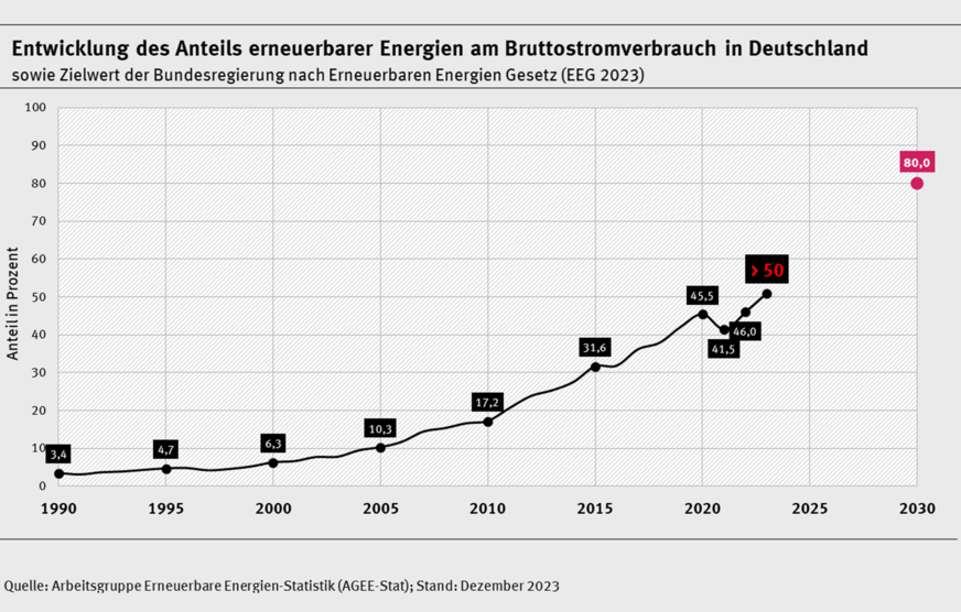 Nach ersten Daten der Arbeitsgruppe Erneuerbare Energien-Statistik (AGEE-Stat) am Umweltbundesamt erzeugt Deutschland in diesem Jahr etwa fünf Prozent mehr Strom aus erneuerbaren Quellen. Weil der Strombedarf zurückging, wird der Anteil erneuerbarer Energien am Stromverbrauch deutlich steigen und erstmals die 50-Prozent-Marke übertreffen. 200 hatte der Ökostrom-Anteil bei 46 Prozent gelegen, 2021 bei 41 Prozent. Haupttreiber der erneuerbaren Stromproduktion waren die Photovoltaik und die Windenergie.