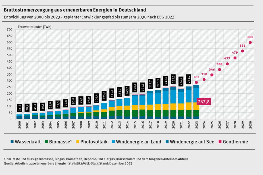 Die Stromerzeugung aus Photovoltaikanlagen stieg wegen des im Vergleich zum Vorjahr deutlich sonnenärmeren Wetters trotz des guten Anlagenzuwachses laut AGEE-Stat nur leicht auf 61 Terawattstunden. Die Stromerzeugung aus Windenergie lag im Jahr 2023 mit knapp 138 Terawattstunden zehn Prozent höher als im windärmeren Vorjahr (davon 83 Prozent an Land und 17 Prozent auf See). Zusammen steuern Solar- und Windenergie etwa 75 Prozent des gesamten erneuerbaren Stroms bei. Das restliche Viertel der Stromerzeugung kommt aus Biomassekraftwerken und Wasserkraftanlagen sowie zu einem sehr geringen Teil aus Geothermieanlagen. Insgesamt betrug die erneuerbare Strommenge im Jahr 2023 bei etwa 268 Terawattstunden.