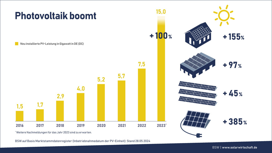 Nach einer Verdoppelung des deutschen Solarmarktes im vergangenen Jahr rechnet der Bundesverband Solarwirtschaft (BSW-Solar) auch in diesem Jahr mit einem weiteren Marktwachstum. „Die neu installierte Leistung von Photovoltaik wird in diesem Jahr voraussichtlich im zweistelligen Prozentbereich wachsen und damit erneut die energiepolitischen Ziele der Bundesregierung einlösen“, sagt BSW-Solar-Hauptgeschäftsführer Carsten Körnig. Er begründet seine Prognose mit Zahlen der Bundesnetzagentur. Sie hat bereits eine neu in Betrieb genommene Solarstromleistung in Höhe von über fünf Gigawatt registriert – das entspricht einem Zuwachs von 35 Prozent gegenüber dem Vorjahreszeitraum. Und auch über das Jahr 2024 hinaus rechnet der Bundesverband Solarwirtschaft mit einer hohen Nachfrage. Jedes zweite Unternehmen (56 Prozent) und über 60 Prozent der privaten Immobilieneigentümer:innen in Deutschland sind an einer Investition in eine Solarstromanlage interessiert. Das ergaben YouGov-Befragungen.