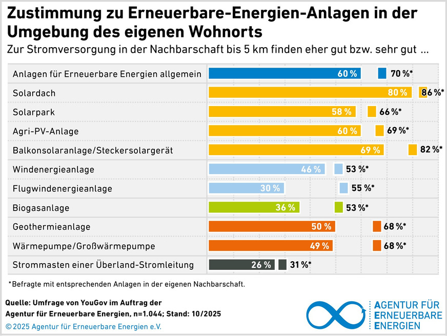 Die hohe Zustimmung der Bevölkerung zum Ausbau der Erneuerbaren zeigt: Die Energiewende ist im Alltag vieler Menschen angekommen. Das Bewusstsein für Versorgungssicherheit und Unabhängigkeit wächst – und wo Erneuerbare-Energien-Anlagen bereits Teil des Umfelds sind, bleibt die Zustimmung überdurchschnittlich hoch.