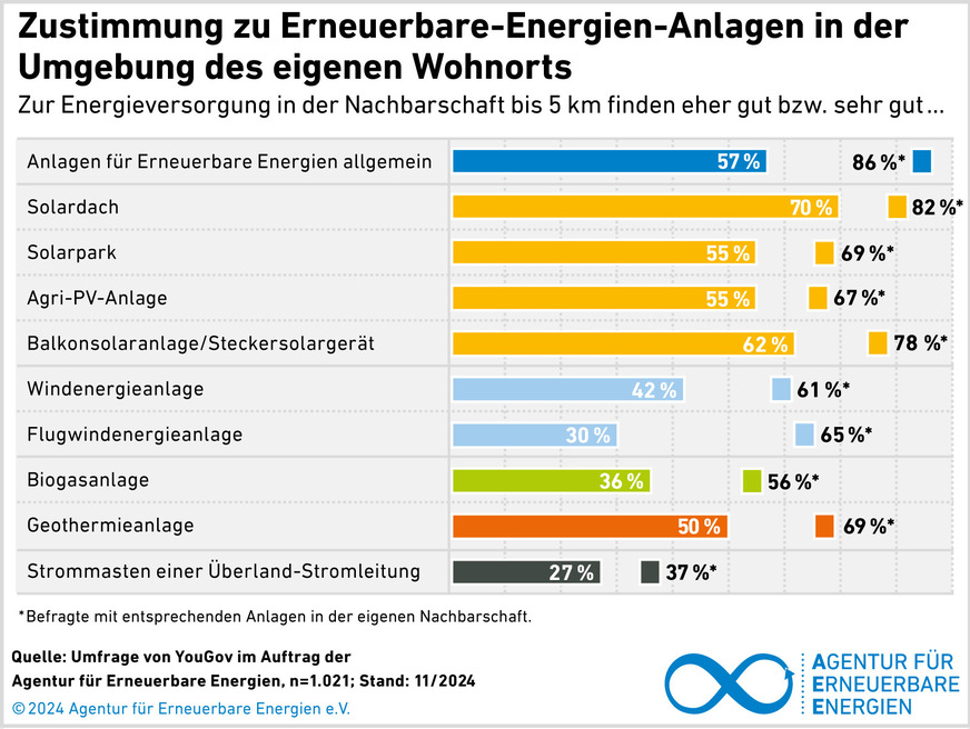 Aufgeschlüsselt nach Solardächern, Steckersolargeräten (Balkon-PV), Solarparks, Agri-PV oder auch Geothermie, Windenergie, Biogasanlagen und Flugwindenergieanlagen zeigte sich bei jeder Technologie und hinsichtlich Strommasten einer Überland-Stromleitung, dass die Akzeptanz der Menschen mit einer Anlage im Umkreis von fünf Kilometern deutlich höher war als unter allen Befragten ohne Vorerfahrungen. Die Zustimmung für Windenergie steigt beispielsweise von 42 auf 61 Prozent, bei Biogasanlagen von 36 auf 56 Prozent.
