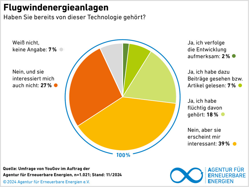 Der größte Unterschied bei der Akzeptanz ist bei den Flugwindenergieanlagen zu sehen. Nur 30 Prozent der Befragten würden eine solche Anlage in der Nachbarschaft befürworten. Mit Vorerfahrung liegt der Wert aber bei 65 Prozent. Hier spielt vor allem der Umstand eine Rolle, dass diese Technologie in der breiten Bevölkerung noch unbekannt ist. Die Anlagen nutzen zur Stromerzeugung Flügel oder Drachen, die an langen Seilen befestigt sind. So erreichen sie starke Windströme in 400 bis 800 Meter Höhe. 39 Prozent der Befragten gaben an, bisher noch nie davon gehört zu haben, aber sie interessant zu finden. 18 Prozent hatten bereits flüchtig etwas davon gehört und ein kleiner Teil verfolgt die Entwicklung aufmerksam beziehungsweise hat dazu bereits etwas gelesen oder gesehen.