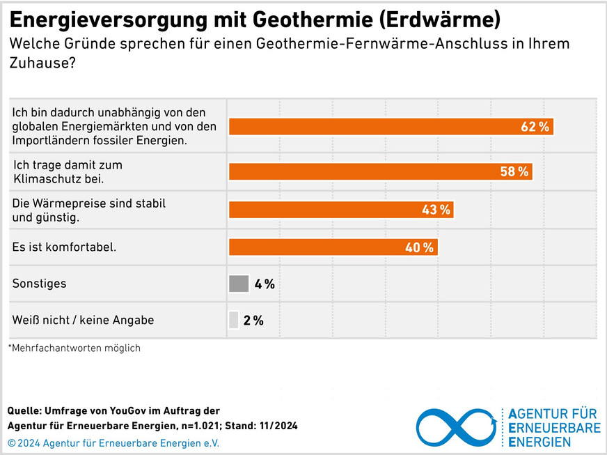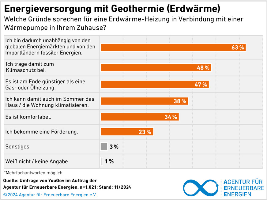 Eine der Möglichkeiten der Umstellung von Öl- und Gasheizungen auf erneuerbare Energien bietet die Geothermie beziehungsweise Erdwärme. Der wichtigste Grund, der bei den Befragten für eine Erdwärme-Heizung mit Wärmepumpe sprach, ist die Unabhängigkeit von den globalen Energiemärkten und von den Importländern fossiler Energien (65 Prozent). Erst danach folgt der Klimaschutz mit 48 Prozent. Günstigere Wärmepreise als mit Öl oder Gas erhoffen sich 47 Prozent.
