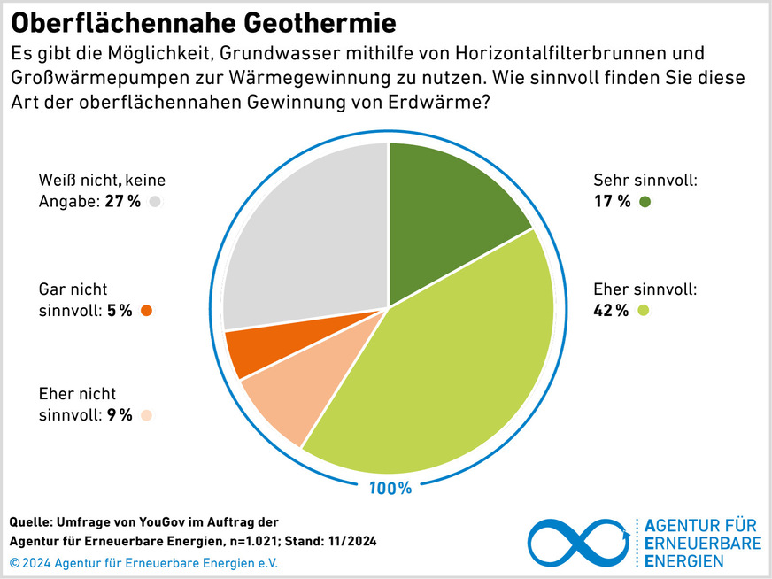 Bei der Geothermie gibt es außerdem eine noch nicht weit verbreitete Möglichkeit der Wärmegewinnung. Dabei wird Grundwasser mithilfe spezieller Horizontalfilterbrunnen und Großwärmepumpen zur Wärmegewinnung und Versorgung von Wärmenetzen im Megawattbereich genutzt. Auch wenn diese Technik fast der Hälfte der Befragten noch unbekannt ist, finden 59 Prozent diese Möglichkeit „sehr sinnvoll“ oder „eher sinnvoll“. Nur 14 Prozent halten nichts oder nicht viel davon. 27 Prozent konnten oder wollten sich dazu nicht äußern.