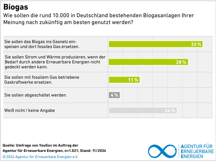 Ein Drittel sprach sich dafür aus, das Biogas aufzubereiten und ins Gasnetz einzuspeisen, damit es dort fossiles Erdgas ersetzen kann. 28 Prozent sehen den sinnvollsten Einsatz darin, dass aus Biogas Strom und Wärme produziert wird, wenn der Bedarf aus anderen erneuerbaren Energien nicht gedeckt werden kann.